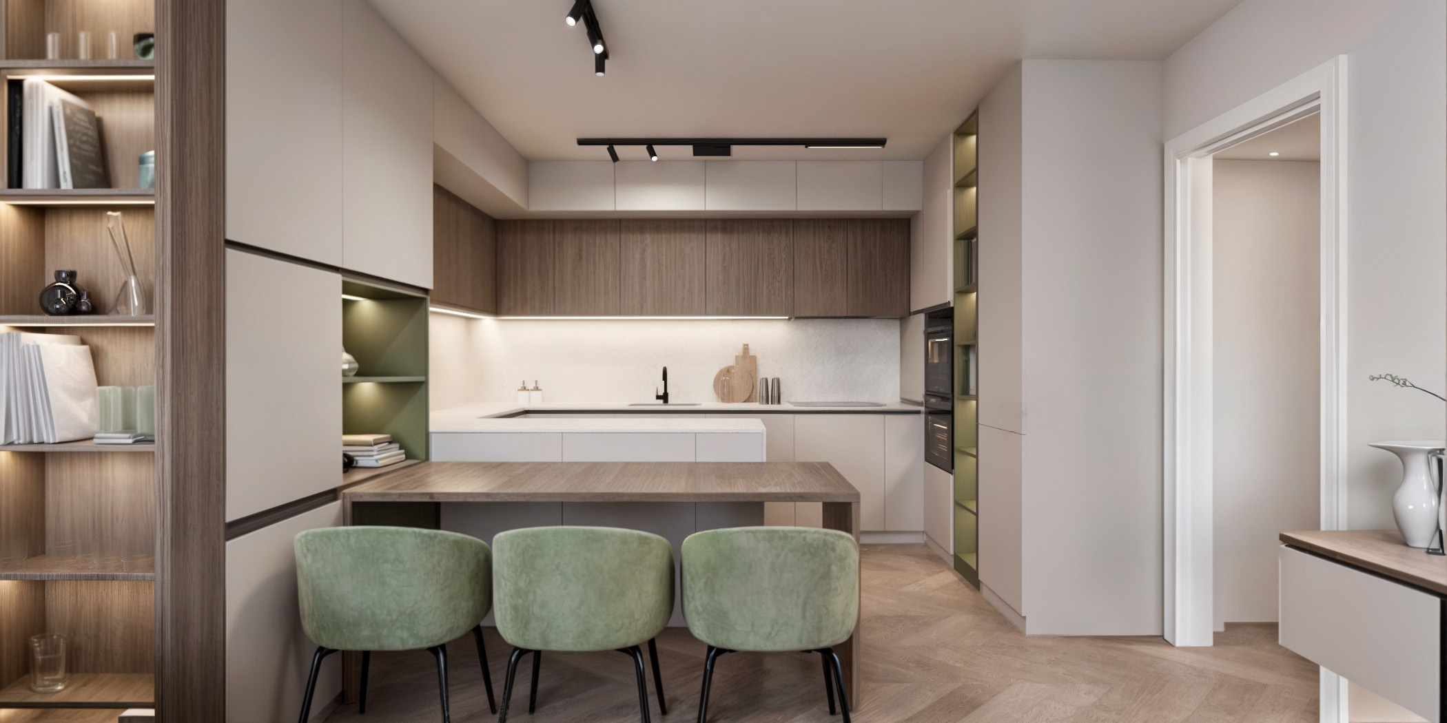Функционален и модерен дизайн на кухни, съобразен с навиците и нуждите на домакинството. Проектът включва разпределение на шкафове и електроуреди, осветление, материали и 3D визуализации за максимална прецизност.